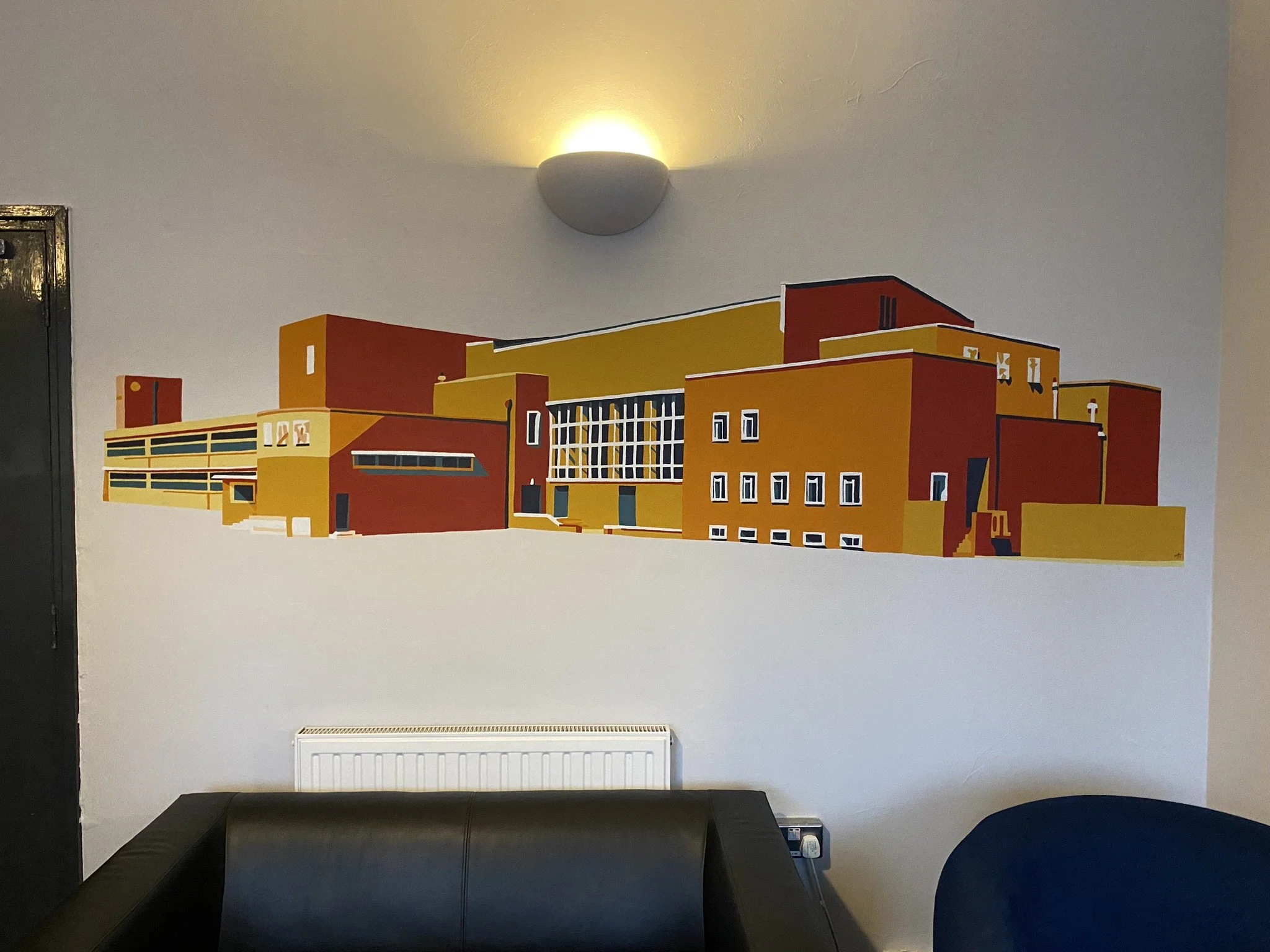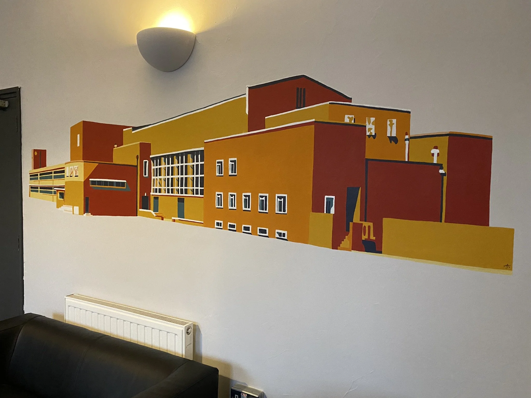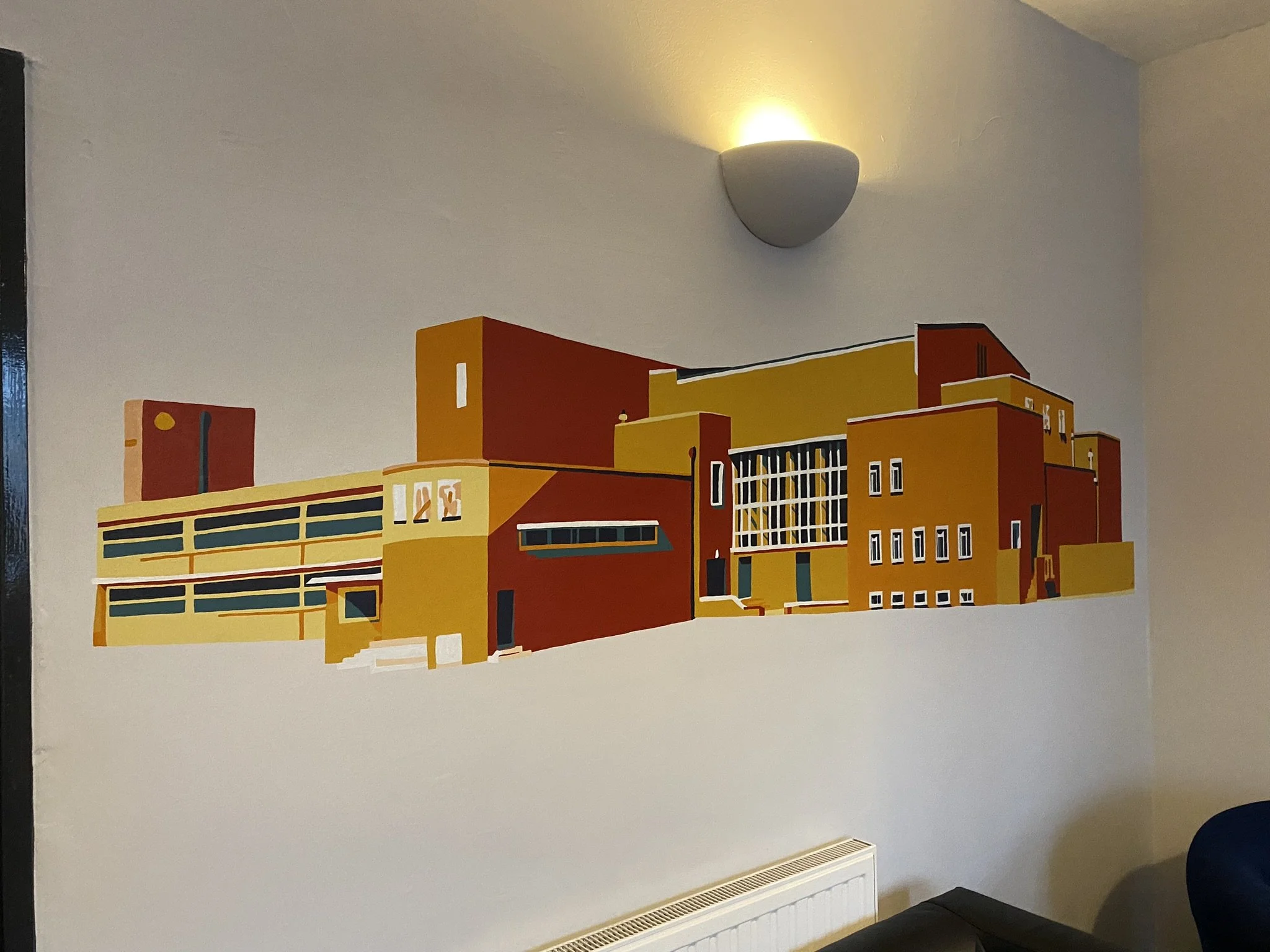 My mural at William Aston Hall was inspired by the building’s rich history and its original opening in the mid-20th century. I based the design on an old photograph from the hall’s early days, reimagining it with a warm, vintage-inspired colour palette to capture a sense of nostalgia and local pride. The piece was painted freehand directly onto the wall using house paint, which proved to be a challenging but rewarding process. Through this project, I explored how my artistic style, rooted in retro tones and graphic forms, could translate into a large-scale, public artwork that celebrates both community and heritage.
