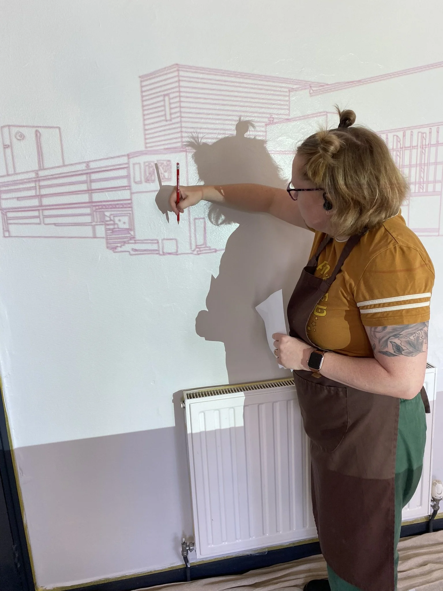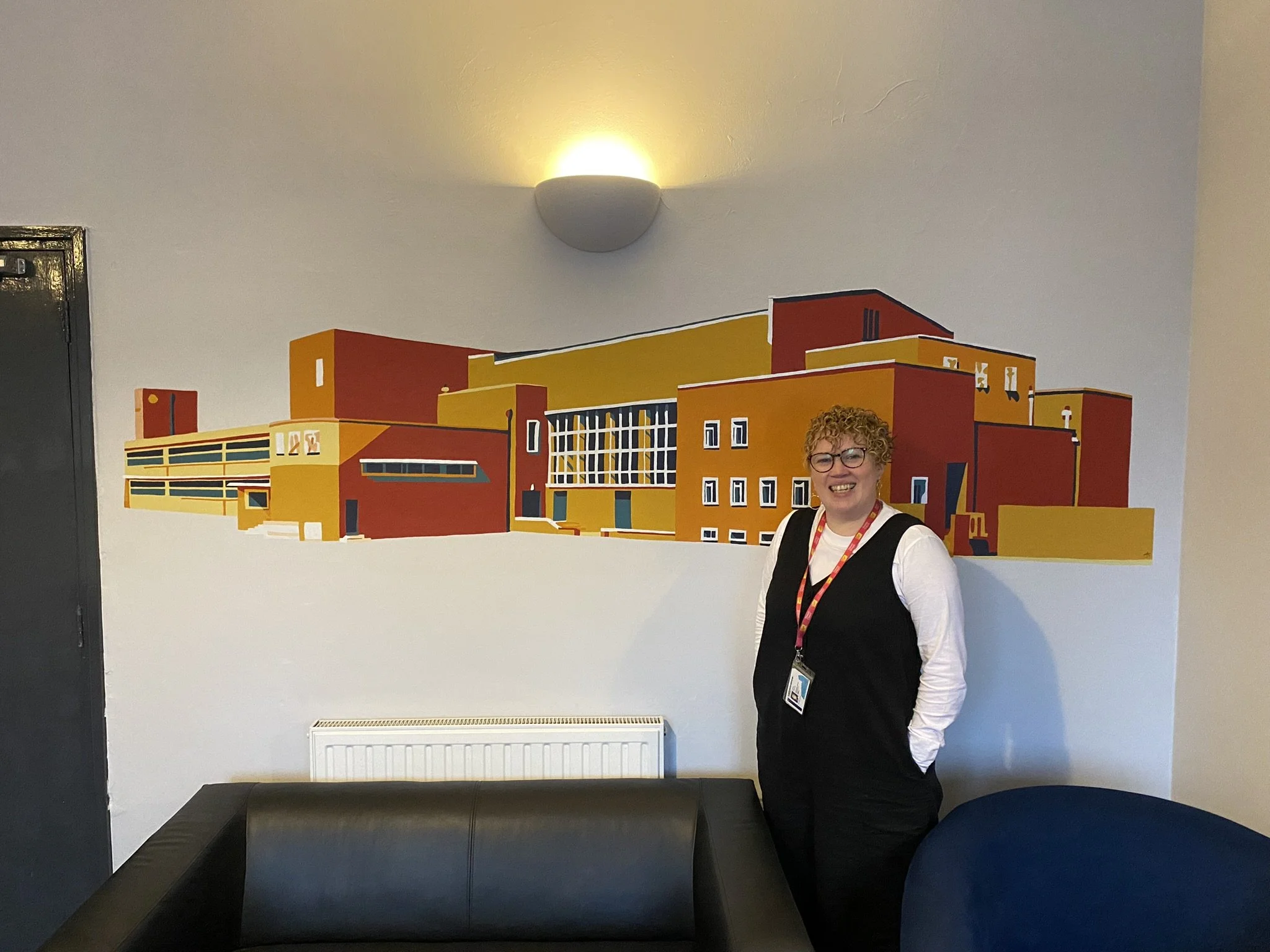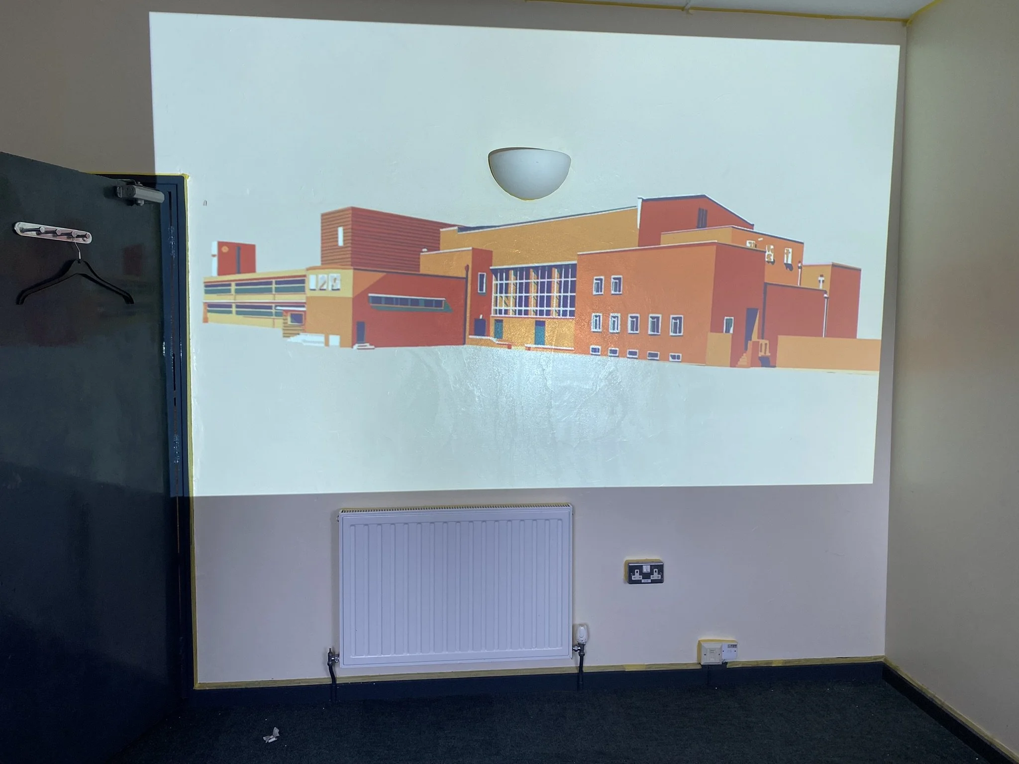 My mural at William Aston Hall was inspired by the building’s rich history and its original opening in the mid-20th century. I based the design on an old photograph from the hall’s early days, reimagining it with a warm, vintage-inspired colour palette to capture a sense of nostalgia and local pride. The piece was painted freehand directly onto the wall using house paint, which proved to be a challenging but rewarding process. Through this project, I explored how my artistic style, rooted in retro tones and graphic forms, could translate into a large-scale, public artwork that celebrates both community and heritage.